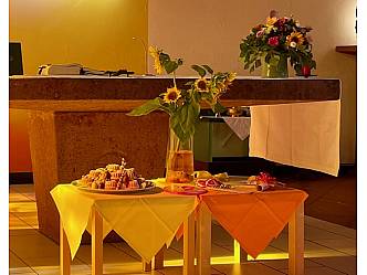 Auf der Bühne waren in sehr ansprechender Weise der Altar, ein Kreuz, drei Kirchenfahnen, der Ambo und ein passender Blumenschmuck platziert.