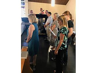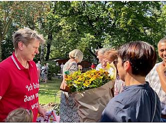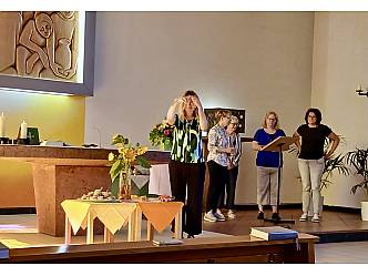 Am 1.9.2024 wurde unsere Gemeindereferentin Andrea Franke in einem Gottesdienst mit musikalischer Gestaltung durch die Gruppe Regenbogen in den Ruhestand verabschiedet. „In einem vor der Kirche aufgezeichneten Geschwätz“ reflektierten langjährige Weggefährtinnen über ihre Stärken und Schwächen und würdigten mit launischen Worten und Geschenken ihr langjähriges Wirken in unserer Pfarrgemeinde.