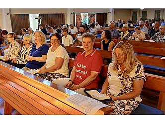 Der Gottesdienst begann mit einem feierlichen Einzug der Feuerwehr-Standarte sowie den Vereinsfahnen der Ortsvereine Kolping, Frauengemeinschaft (KFD) und Gesangverein, die vor der Bühne und dem Altar Aufstellung nahmen.